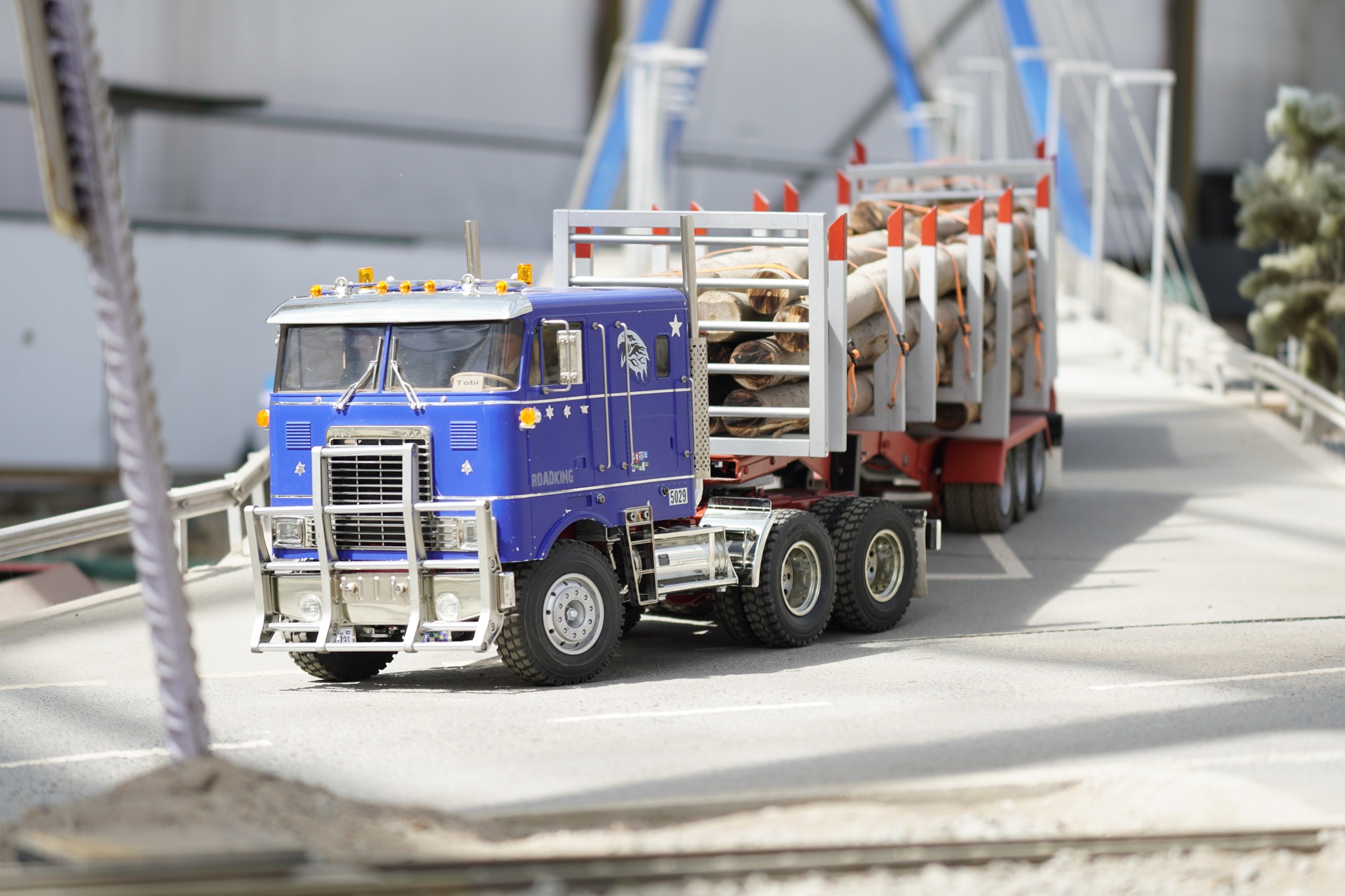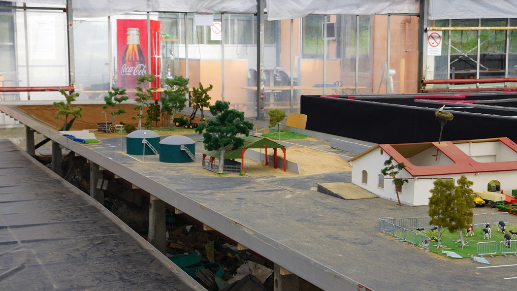 Unsere „LKW-Stadt“ auf 290 m² besteht u.a. aus einem Container-Terminal mit Containerbrücke, Kiesgruben, Häusern, Tankstelle, Baustofflager und einem Parkplatz „zum Einhalten der Lenkzeiten“. In einer weiteren Halle befindet sich seit 2023 der große Tagebau (150 m²) für Baufahrzeuge aller Art und seit 2024 eine Stückgutanlage (60 m²), auf welcher die LKWs mit ihren verschiedenen Ladegütern von Gabelstaplern abgefertigt werden. Seit 2024 sind diese Anlagen durch eine LGB-Eisenbahnstrecke miteinander verbunden.