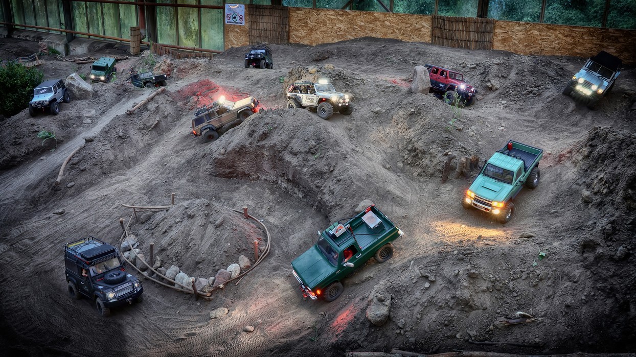 Unsere Scaler-Strecke (60 m²) wird von Fahrzeugen im Maßstab von 1:16 bis 1:10 befahren. Diese Anlage bietet den Offroadern unter den RC-Fahrern die Möglichkeit, ihre scaligen Geländewagen (z.B. Jeep, Toyota Land Cruiser, Land Rover usw.) im Maßstab 1:10 in angepasster Geschwindigkeit über die Hindernisse zu manövrieren.